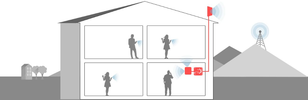 An outside antenna captures the signal, the signal booster amplifies the signal’s strength, then indoor antenna(s) send the improved signal to your phone.